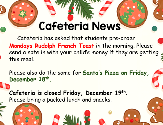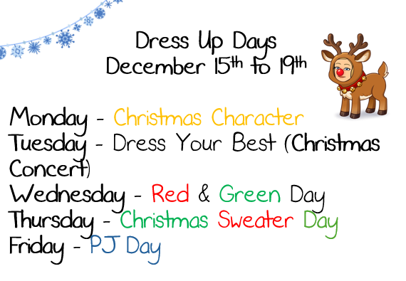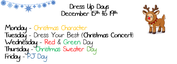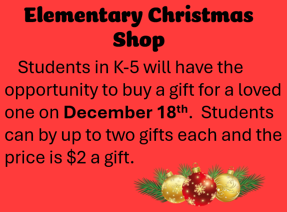 Christmas Shop: On December 18th, students will have the opportunity to purchase 2 gifts from the Christmas Shop. Each gift will cost $2 each. Elves will be there to wrap gifts for students to take home.